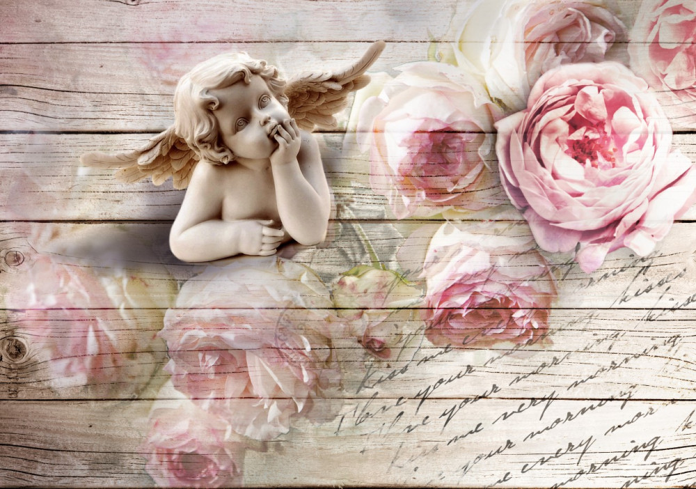Carta da parati angelo pensieroso e rose rosa (articolo a90949 ) da categoria Carta da parati Floreale