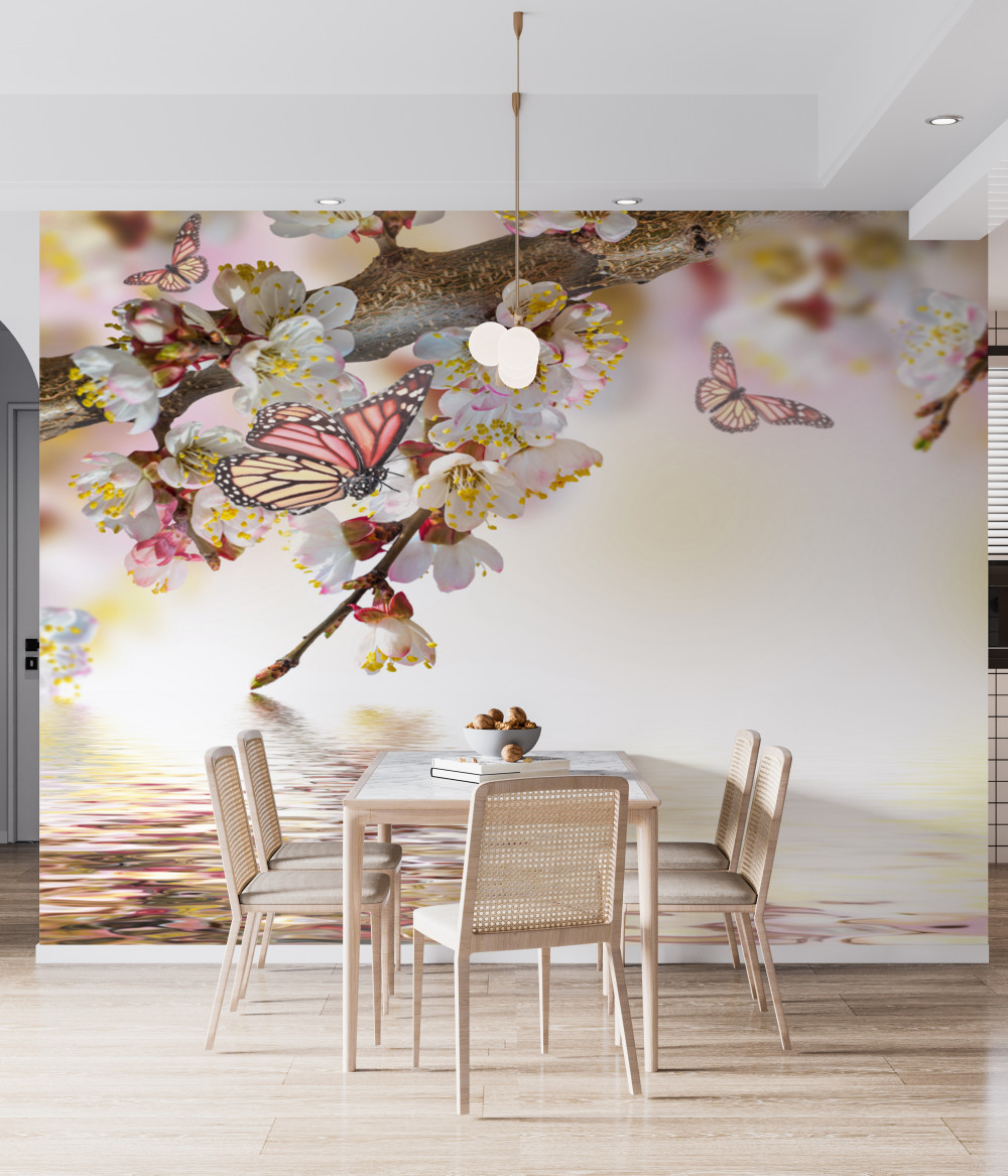 Carta da parati le farfalle volano sopra i fiori luminosi