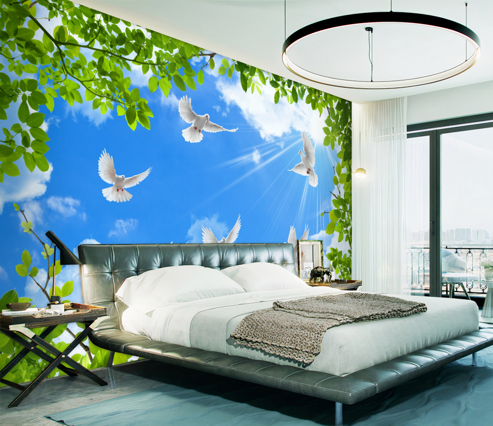 Carta da parati colombe sul cielo blu nella cornice verde (articolo a90381 ) da categoria Carta da parati Cielo