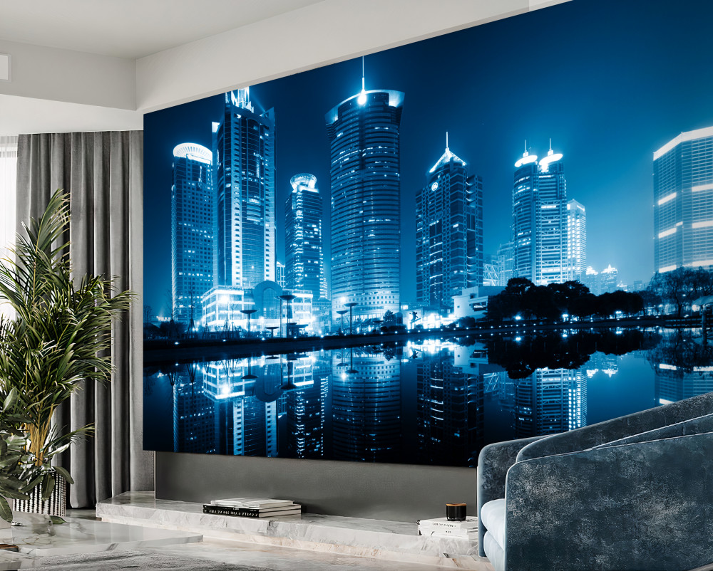 Carta da parati grattacieli notturni nel riflesso dell'acqua