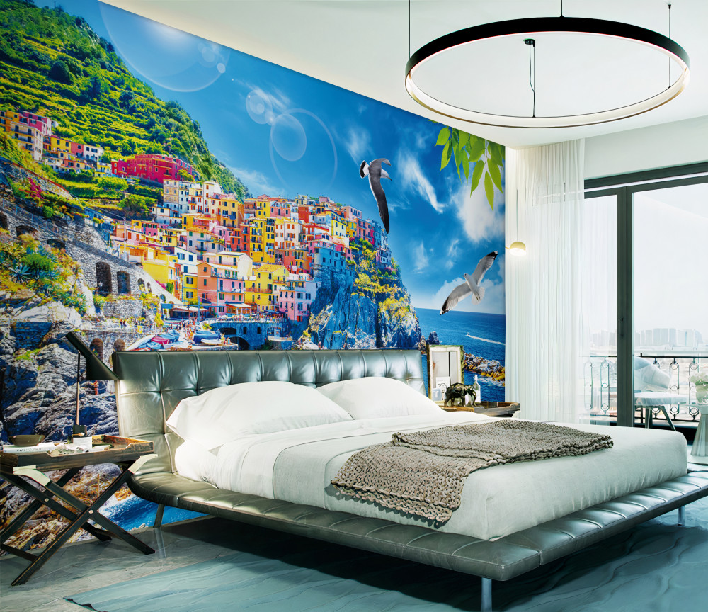 Carta da parati luminosa cittadina in riva al mare sugli scogli (articolo a94263 ) da categoria Carta da parati Mare e spiaggia
